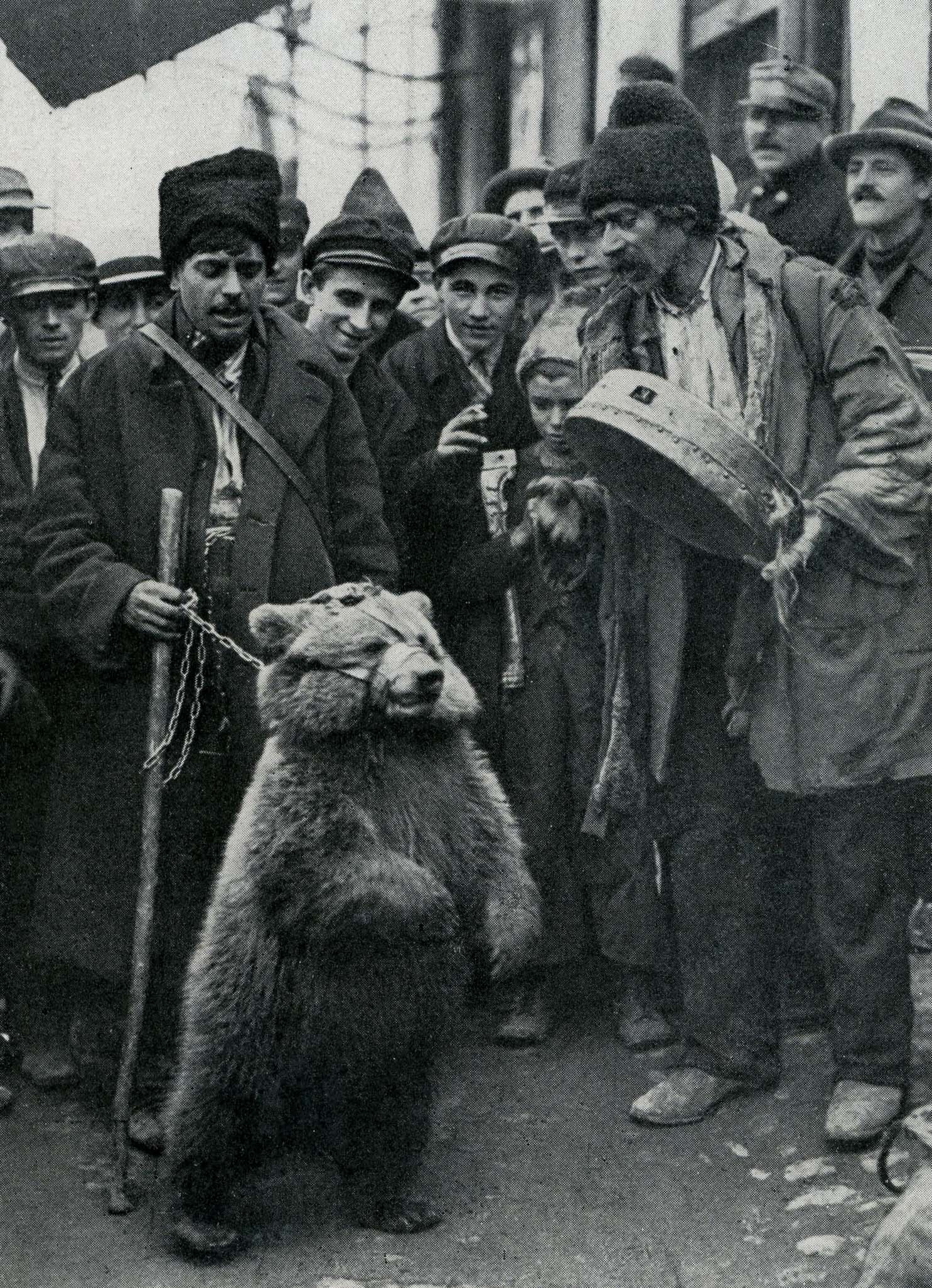 Gypsies teach their dancing bears to massage the muscles of poor people, weary from working all day in the fields. The patients lie flat on the ground and seem to enjoy Dr. Bear’s somewhat heavy-footed treatment. While a policeman (upper right) keeps an eye on the group, one of the itinerants beats time with his hand-made drum and his partner handles the well-muzzled performer, to the delight of a crowd of youngsters in high-school uniform.