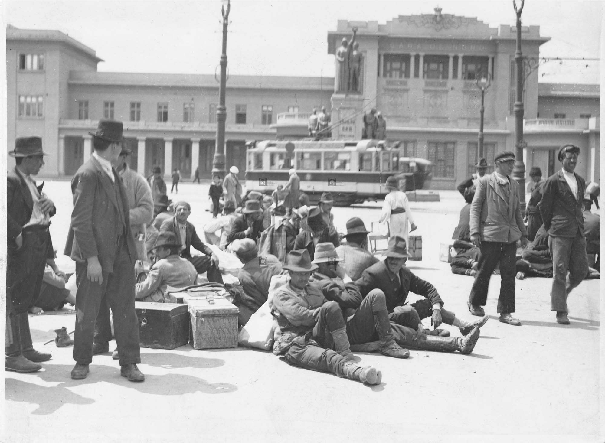 Unemployed people on the bridge in front of the Brâncoveanu Hospital (Spitalul Brâncovenesc), 1933