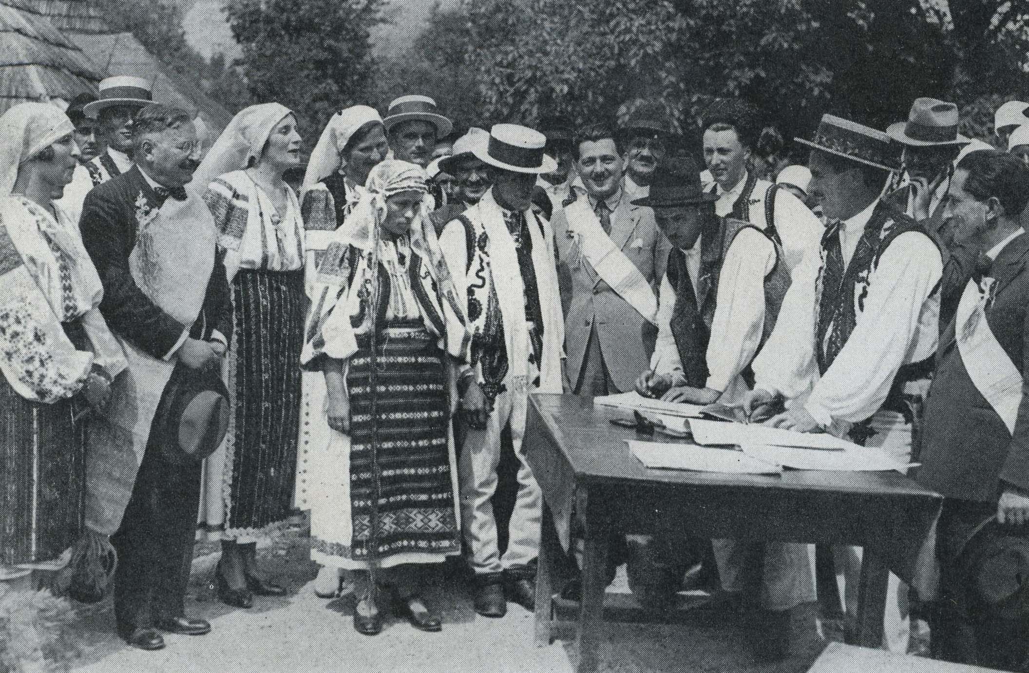 Law prescribes a civil ceremony before the church wedding can be performed. Here an Oltenian peasant bridegroom in a straw hat leads his bride before the mayor, the smiling young man standing at the far end of the table and wearing the official scarf. Two peasant friends sign as witnesses. The next stop is the church, where the priest will marry the happy pair again.