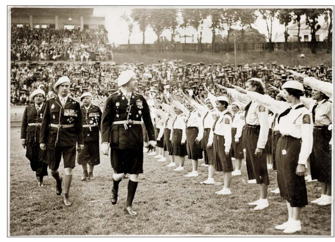 Celebrating the Union in Bucharest. At the Celebration of the Union, the 8th of June is dedicated to the watchmen, who are here saluting the major commander ,, His Majesty King Carol II of Romania, on the „Prince Carol” stadium. The photo depicts his Majesty King Carol II surveying the troups, together with the watchmen commander. In the stands there are 30.000 spectators, despite the rainy weather.