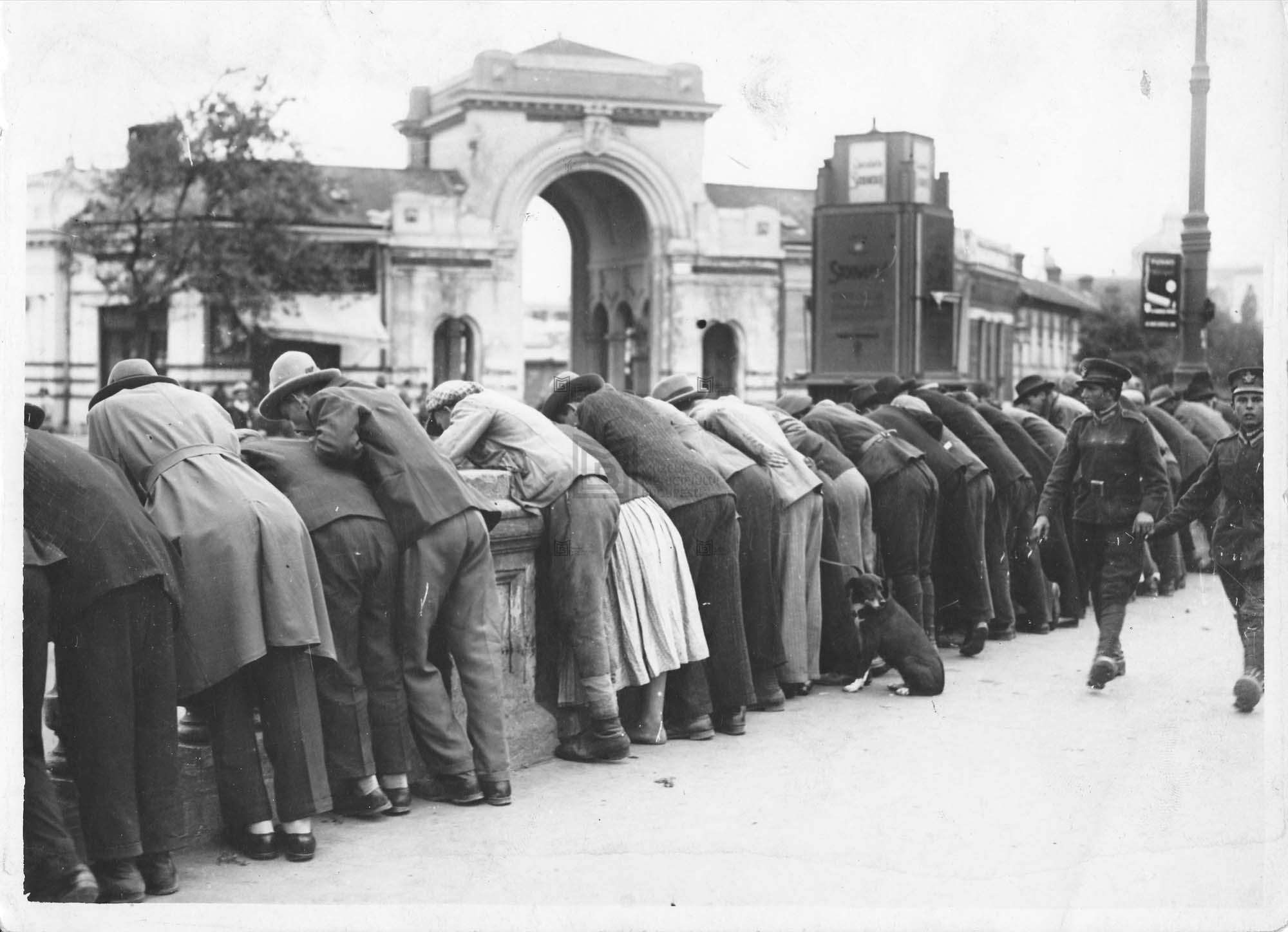 Unemployed people on the bridge in front of the Brâncoveanu Hospital (Spitalul Brâncovenesc), 1933