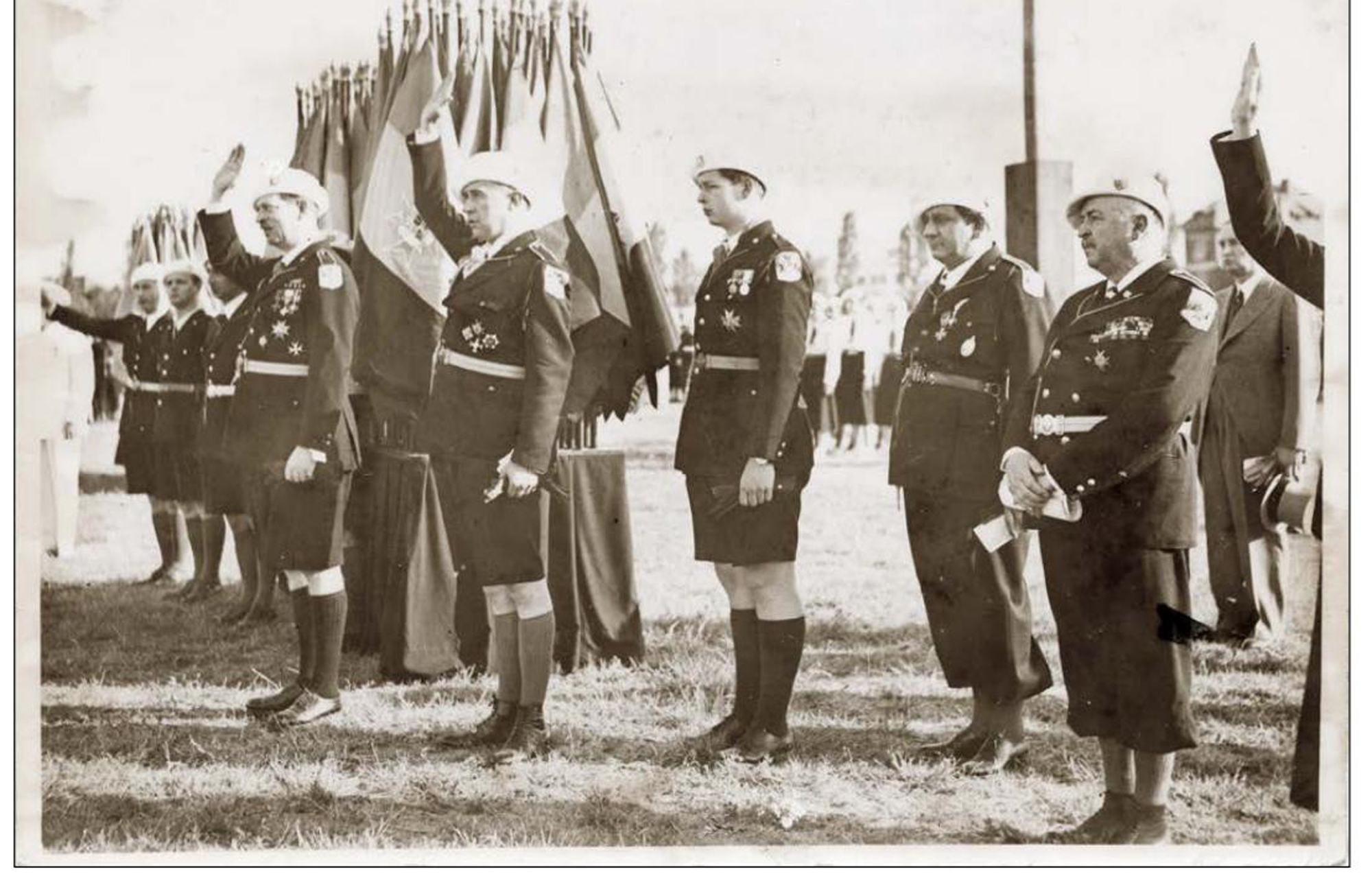 Celebrating the Union in Bucharest. We can see his Majesty king Carol II of Romania, on his left Sidorovici, the commander of watchmen and Mihai, the heir prince, during the singing of the royal anthem. The occasion was that of the sharing of flags with the watchmen commanders. The king and the prince are wearing the uniform of the Romanian watchmen.